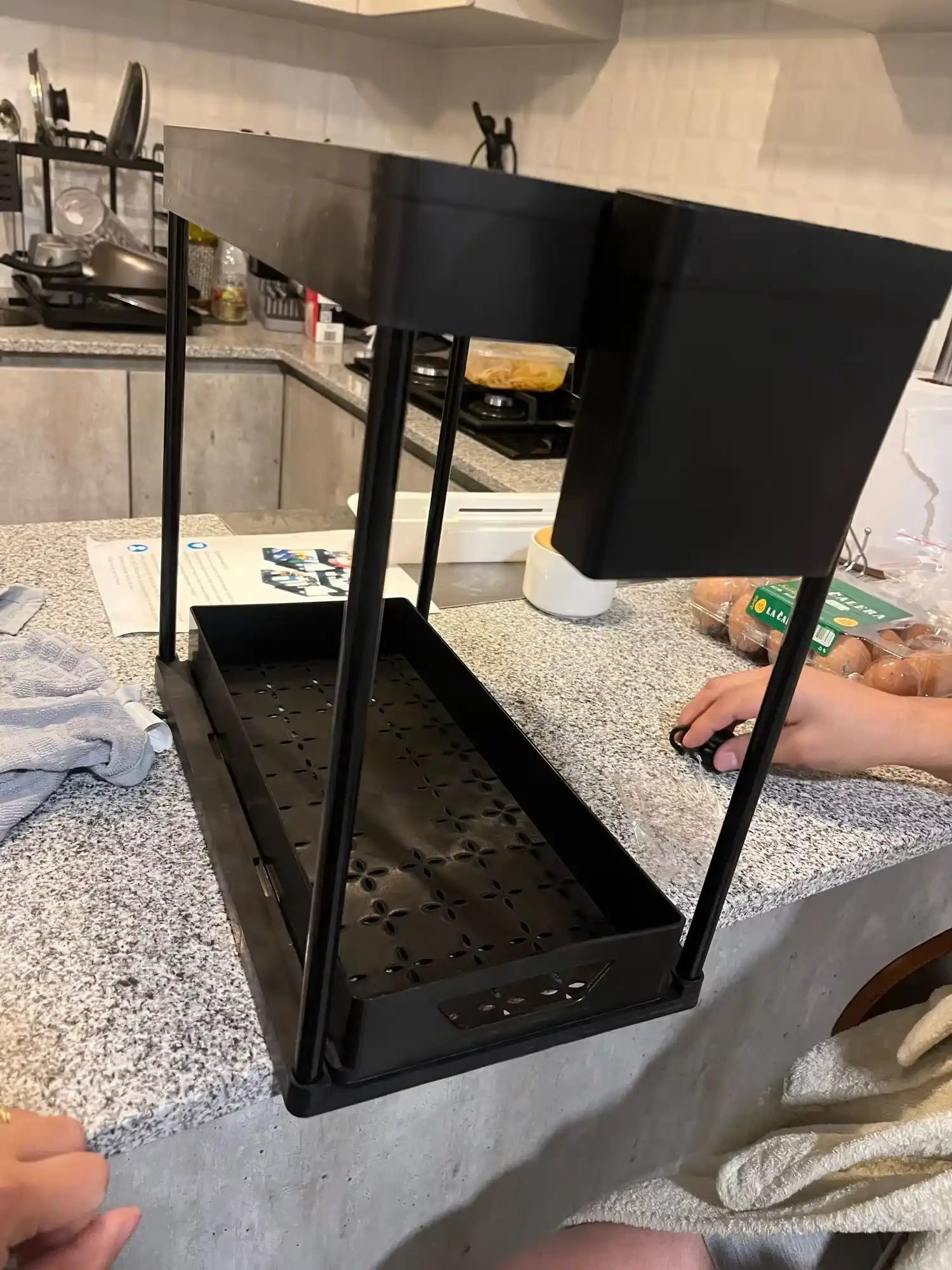 "Ich liebe diesen Organizer! Er ist genau das, was ich brauchte, um meine Küche und mein Badezimmer aufzuräumen. Der Zusammenbau war auch super einfach. Jetzt habe ich mehr Platz und es sieht ordentlich aus. Sehr empfehlenswert, wenn du schnell aufräumen willst!"